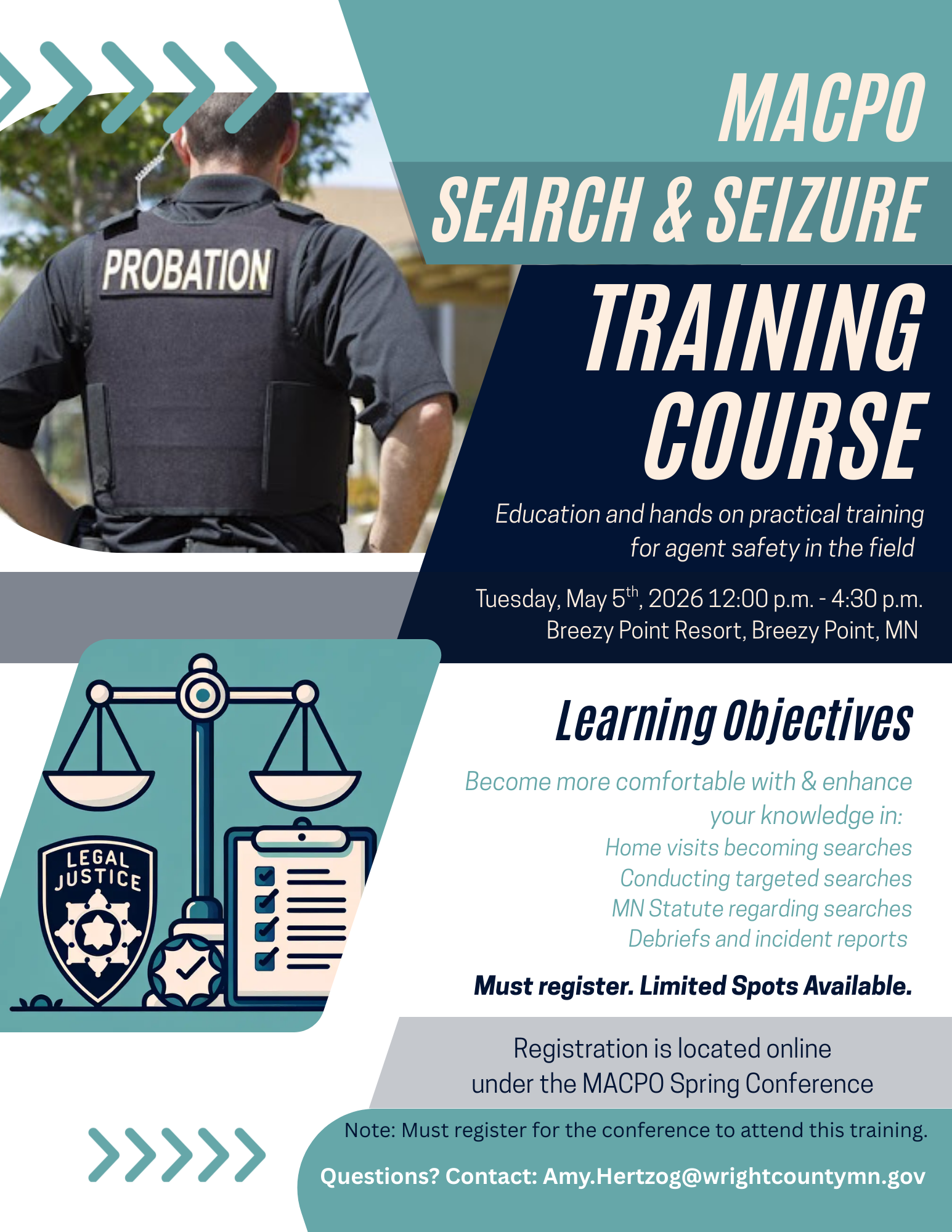 Registration for the MACPO Search and Seizure Training on Tuesday, May 5, 2026, and is open to the first 40 participants. This will be held in The White Birch Room. Scenario base participation is required and must be comfortable with conducting home visits.